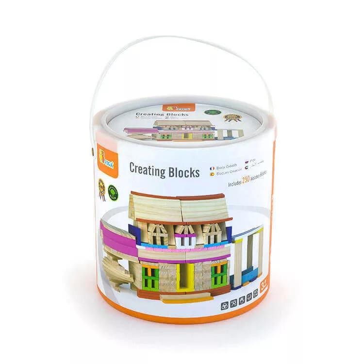 250 db-os fa építőjáték, mely alkalmas egyéni és csoportos játékra is. Nem kell hozzá más, csak egy kis kreativitás és ügyesség. Fejleszti a gyermek finommotorikus készségeit és kreativitását, valamint a térlátást is. Egy kis fantáziával csodaszép épületeket építhetünk a színes elemekkel.