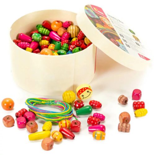 A fajátékok és a gyöngykészlet kombinációja segít a gyerekeknek abban, hogy többféle anyaggal és textúrával ismerkedjenek meg. A fa természetessége és a gyöngyök színes világa együtt stimulálják a gyermek érzékszerveit, miközben elősegítik a kreatív gondolkodást.