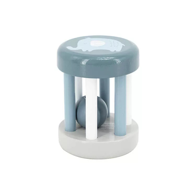 Fából készült pasztell színű csörgő, elefánttal és macival díszítve. Kis méretének köszönhetően könnyen kézbe tudják venni már a babák is. Az hengerben található színes golyó nem csak díszítőelemként szolgál, hanem ez adja meg a csörgő hangját. Gurítani is lehet, mellyel kúszásra, mászásra tudjuk ösztönözni a kicsiket. Játék közben fejlődik a finommotoros készség és szem-kéz koordináció.