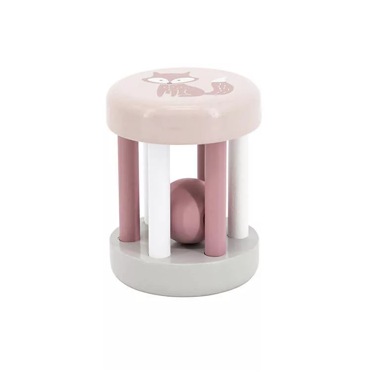 Fából készült pasztell színű csörgő, rókával és macival díszítve. Kis méretének köszönhetően könnyen kézbe tudják venni már a babák is. Az hengerben található színes golyó nem csak díszítőelemként szolgál, hanem ez adja meg a csörgő hangját. Gurítani is lehet, mellyel kúszásra, mászásra tudjuk ösztönözni a kicsiket. Játék közben fejlődik a finommotoros készség és szem-kéz koordináció.
