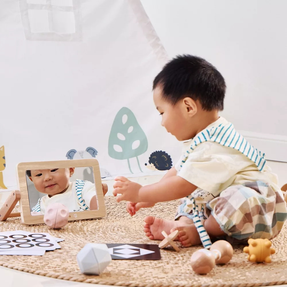 A tükörjáték egyszerre vizuális és szociális–érzelmi élmény. A baba megfigyeli saját arcát és reakcióit, ezzel korán fejlődik az önismeret és a szemkontaktus tartása.