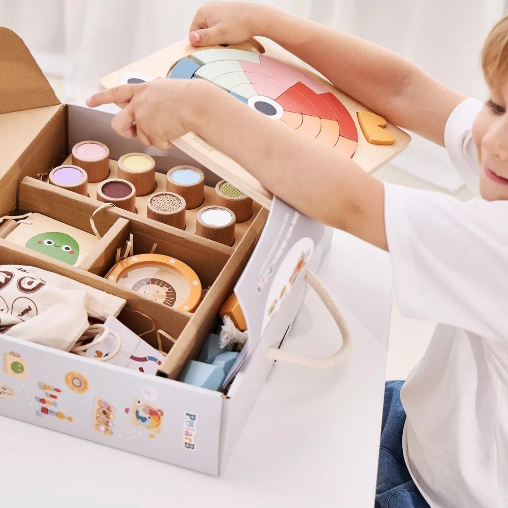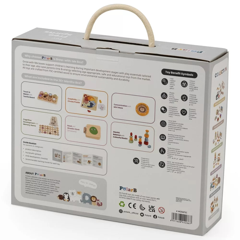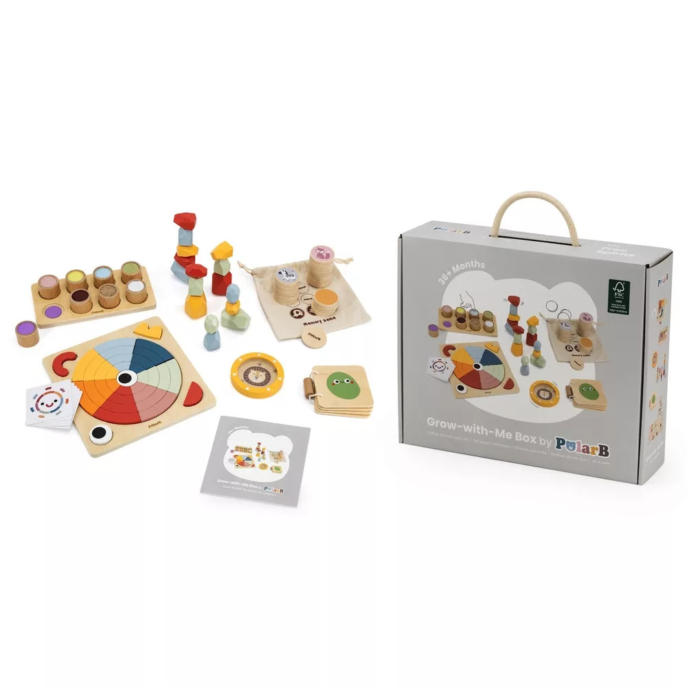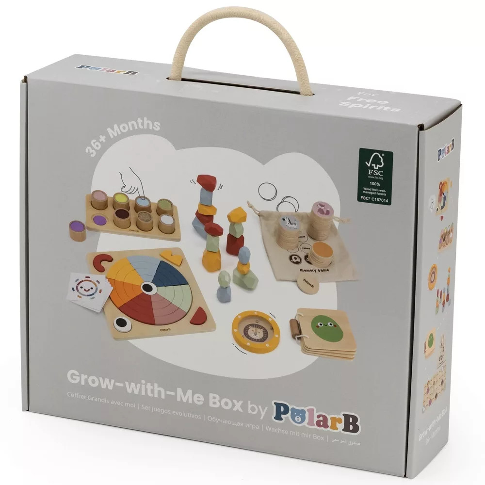 Növekedj Velem Játékkészlet – Szabad Szellemeknek (36 hó+): üdv a nyitott végű játék világában! A doboz tapintótáblát, „Érzelmek” fa könyvet, kör kirakót, mini labirintust, színes egyensúlyozó köveket és memóriajátékot tartalmaz, hogy a gyerekek életkorukhoz igazított eszközökkel fedezzék fel a kreativitást, a logikát és az érzelmeket.