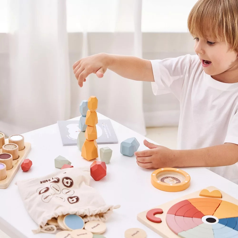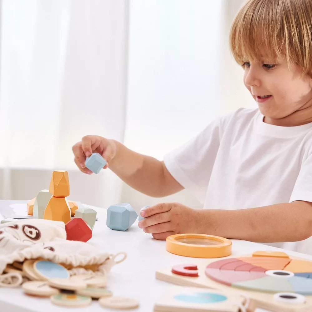 Rakosgasd, egyensúlyozd és építs! 16 különböző méretű és színű kő – épp elég a kezdéshez! A kövek egymásra rakása és az egyensúly megtartása nagy türelmet igényel, és komolyan próbára teszi az ujjak ügyességét és a finommotorikát. Ez az építő- és egyensúlyozó játék nyitott végű játék révén szikráztatja a képzeletet.