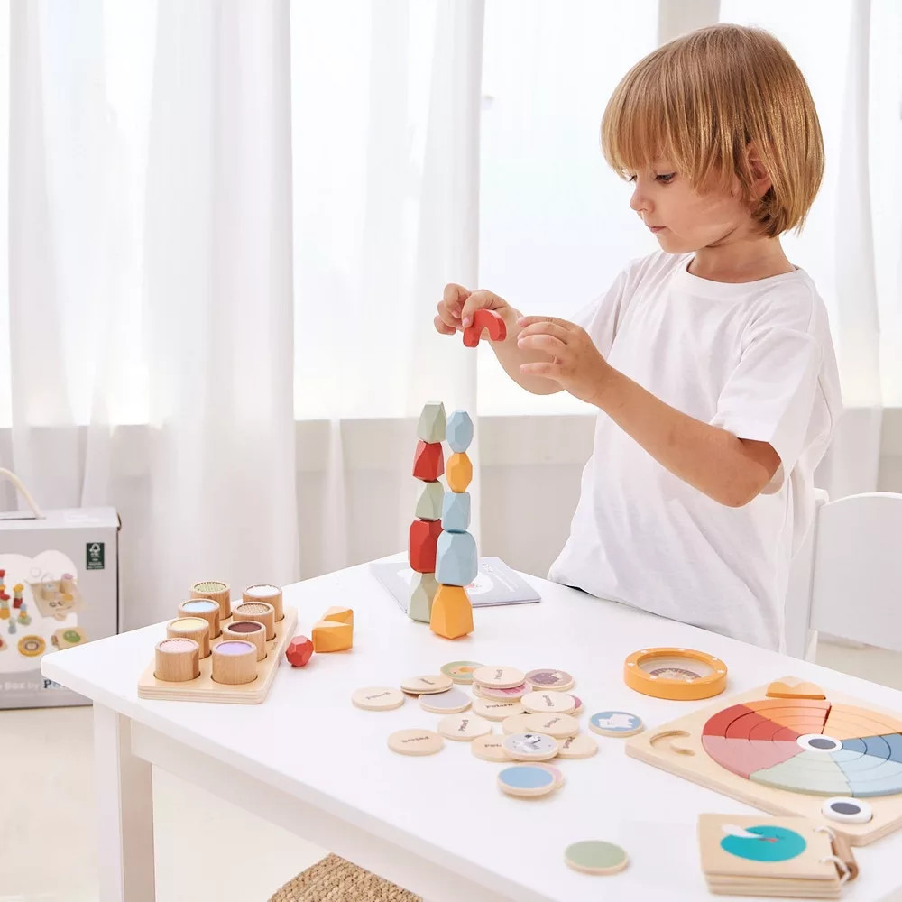 Az egyensúlyozáson túl a méretek és színek tanulására is alkalmas.