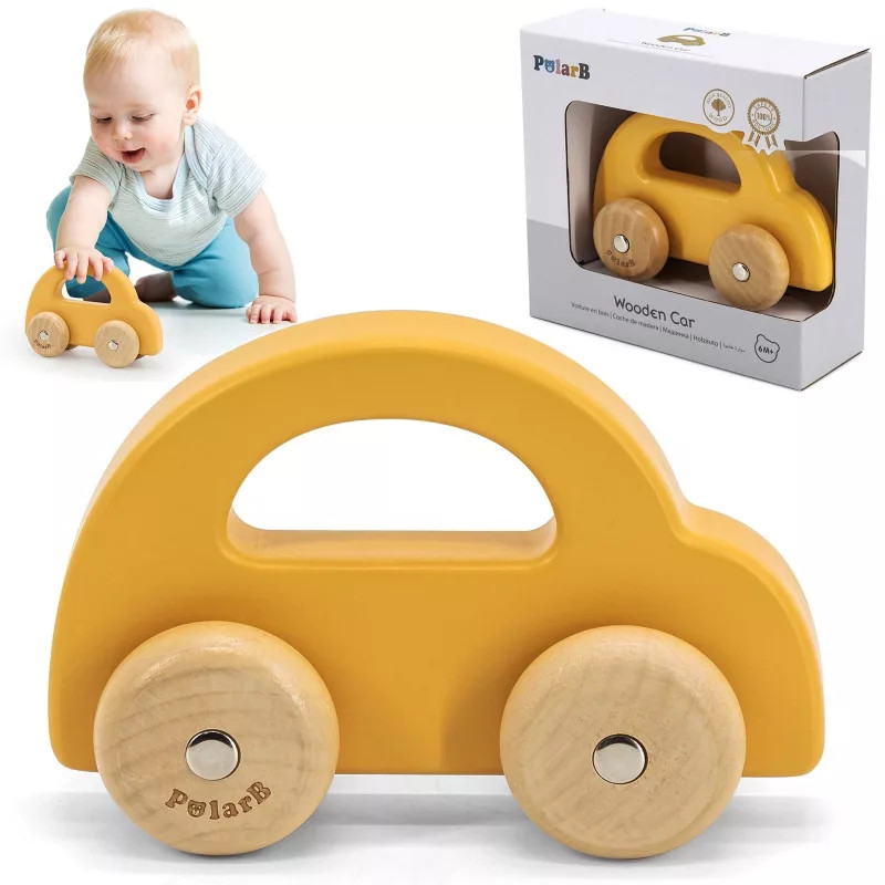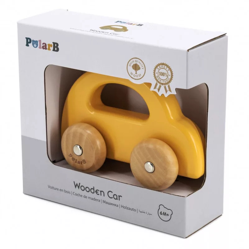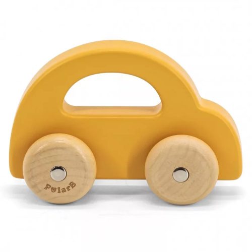 Viga gurulós kisautó fából - sárga