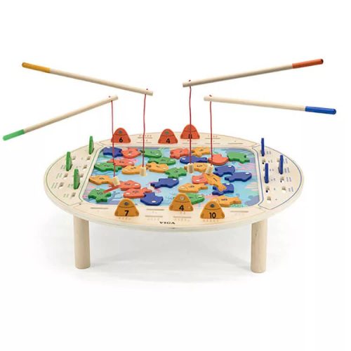Mágneses horgászjáték kerek asztalon. Ez a szórakoztató és izgalmas fából készült horgászjáték kiváló lehetőséget nyújt a színek megismerésére, számolási készségek, valamint a szem-kéz koordináció fejlesztésére. Egyszerre akár négy fő is játszhat, a négy mellékelt horgászbotnak köszönhetően. A játék lényege, hogy mindenki ugyanolyan színű halat fogjon ki, amilyen színű a horgászbotjának a vége, ezzel is fejlesztve a koncentrációs készséget.