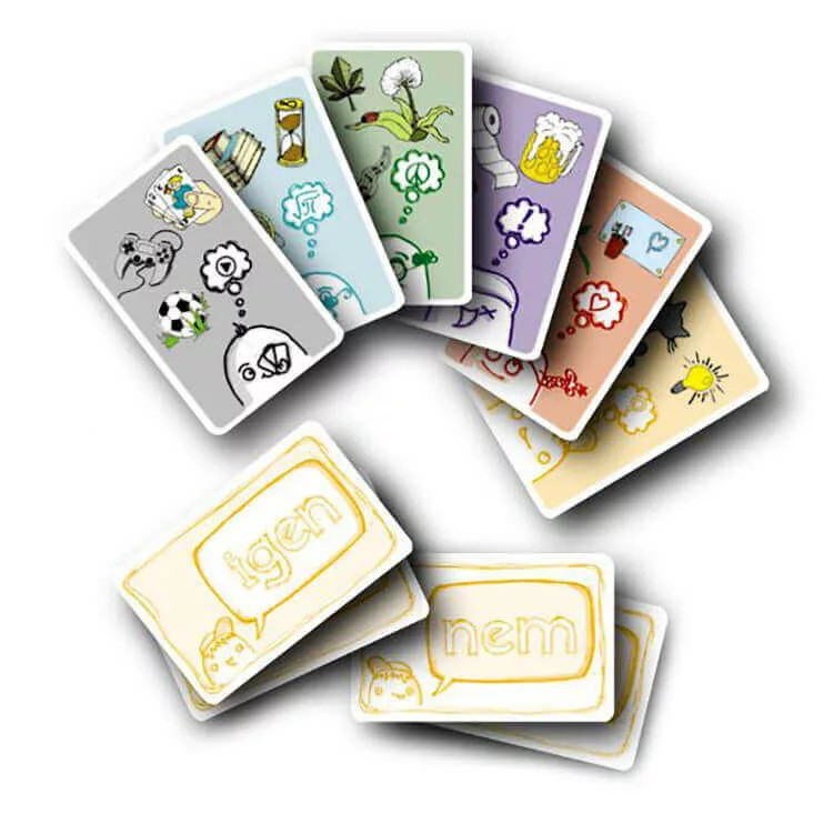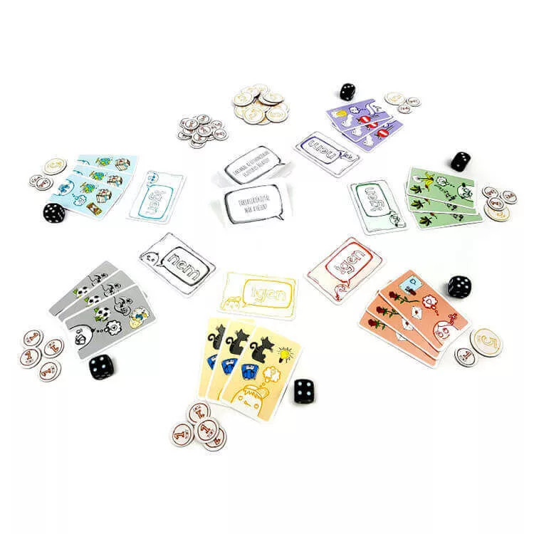 Igen? - Társasjáték Elhangzik egy - gyakran személyes - kérdés, amire a játékosoknak IGEN-nel vagy NEM-el kell - titkosan - válaszolniuk. A játék célja, hogy megtippeljük a választ. Tartalom: - 6 db dobókocka - 24 db játékoskártya - 220 db kérdéskártya (kétoldalas) - 18 db 5-ös és 30 db 1-es pontozójelző - Játékszabály https://boardgamegeek.com/boardgame/257991/igen Az Igen? - Társasjátékról bővebben:
